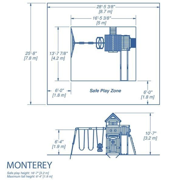 With the Monterey Swing Set, your children can enjoy all the charm and fresh air of a summer shore house combined with classic playset activities. This beautifully designed set features an upper clubhouse with a ladder and rock climbing wall entry points, a balcony, peaked roof, and diamond-shaped peep holes for endless imaginative play.