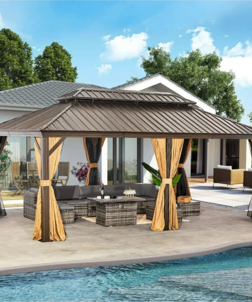 - Covered snack area, activity table, and built-in bench for rest and play
